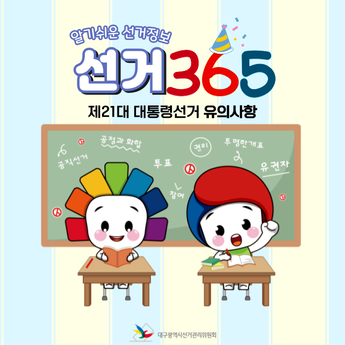 대구광역시선거관리위원회 홍보과(053-767-2584)에서 제작한 선거365 #41 제21대 대통령선거 유의사항 저작물은 "공공누리" 출처표시-상업적 이용금지-변경금지 조건에 따라 이용할 수 있습니다. 자세한 내용은 [저작권정책]을 확인하십시오.