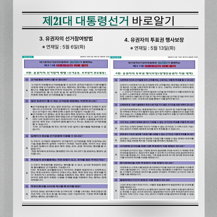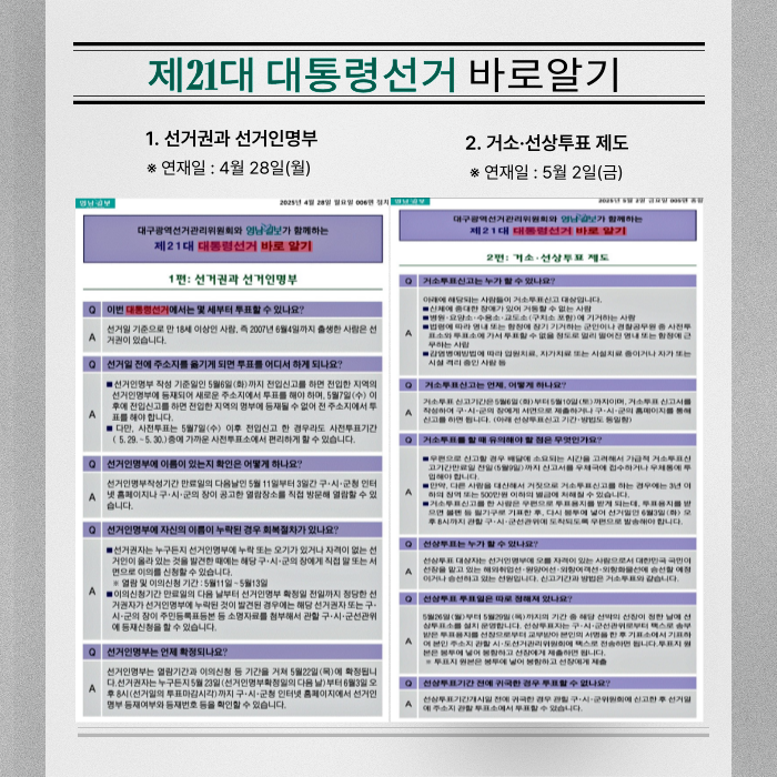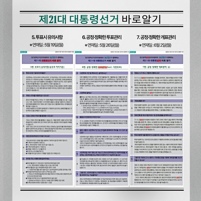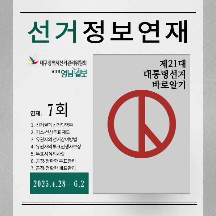 대구광역시선거관리위원회 홍보과(053-767-2584)에서 제작한 [제21대 대통령선거] 제21대 대통령선거 바로 알기 (with 영남일보) 저작물은 "공공누리" 출처표시-상업적 이용금지-변경금지 조건에 따라 이용할 수 있습니다. 자세한 내용은 [저작권정책]을 확인하십시오.